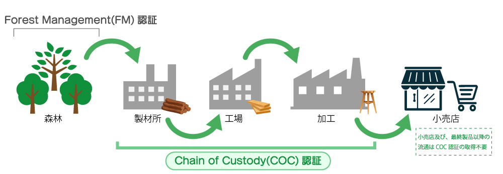 COC(Chain of Custody:加工流通過程の管理)認証とは、FM(森林管理)認証を受けた森林から産出された原材料を、適切に管理・加工しているかを第三者から審査を受け認証する制度です。